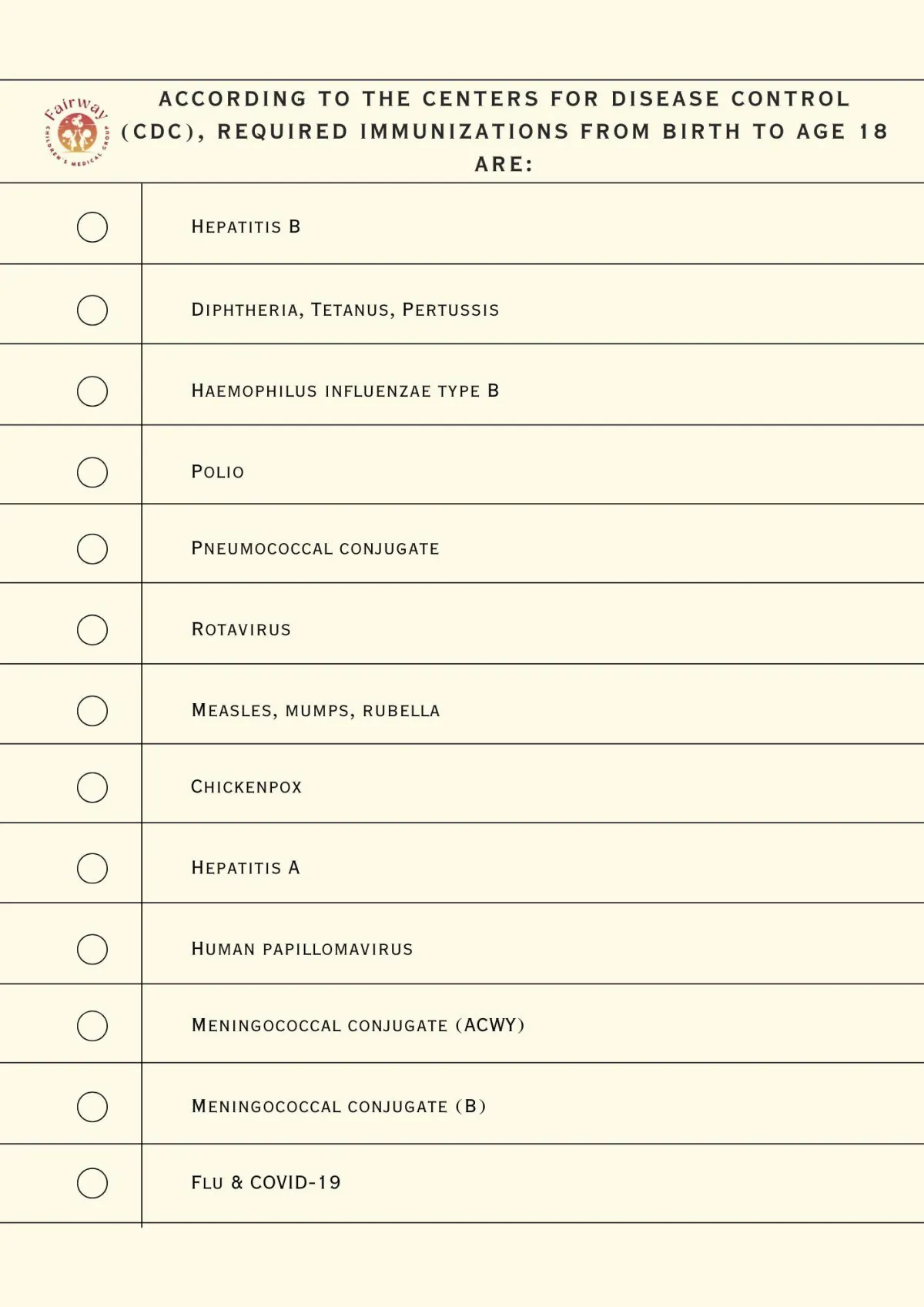 Schools require certain vaccinations to help prevent the spread of communicable diseases. Your pediatrician will ensure your child is up to date on all mandatory shots.